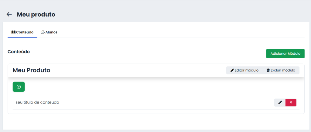 - Depois, adiciona os conteúdos (vídeos, PDFs, links, etc.) através do botão verde