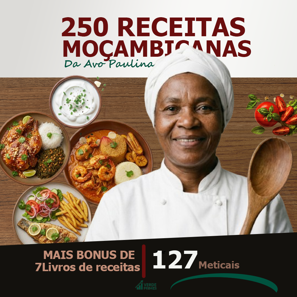 “250 Receitas Moçambicanas autênticas, preparadas com ingredientes que você encontra facilmente no seu mercado, pensadas para ajudar você a surpreender e encantar toda a sua família.